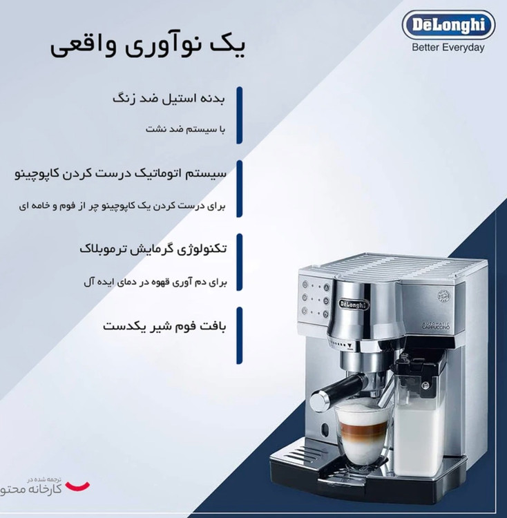 اسپرسو ساز دلونگی مدل EC850M، یکی از بهترین و مورد علاقه مصرف کنندگان اسپرسوهای خانگی است. این دستگاه با طراحی شیک و زیبا، قابلیت تهیه اسپرسو با طعم و عطری مطلوب را به شما میدهد. اسپرسو ساز دلونگی مدل EC850M با قدرت 1450 وات و فشار 15 بار، توانایی استخراج قهوه ای با کیفیت بالا را دارد. همچنین، این دستگاه دارای صفحه نمایش LCD و کاربری آسان است. با کنترل دما، شما میتوانید دمای اسپرسو را به دلخواه خود تنظیم کنید و اسپرسویی با طعم مطلوب بسازید. با استفاده از این دستگاه، میتوانید اسپرسوهای مختلفی از جمله اسپرسو، کاپوچینو، لاته و موکا سازی کنید. همچنین، دستگاه دارای یک پایه برای گرم نگه داشتن فنجان اسپرسو است که باعث میشود اسپرسو شما در دمای مطلوب و بهترین شکل سرو شود. در کل، اسپرسو ساز دلونگی مدل EC850M، یکی از بهترین و جذابترین دستگاههای تهیه اسپرسو برای استفاده در منزل و یا محیطهای کاری است. با داشتن این دستگاه، میتوانید به سادگی و با کیفیتی بالا، اسپرسویی با طعم مطلوب بسازید و لذت بخشید