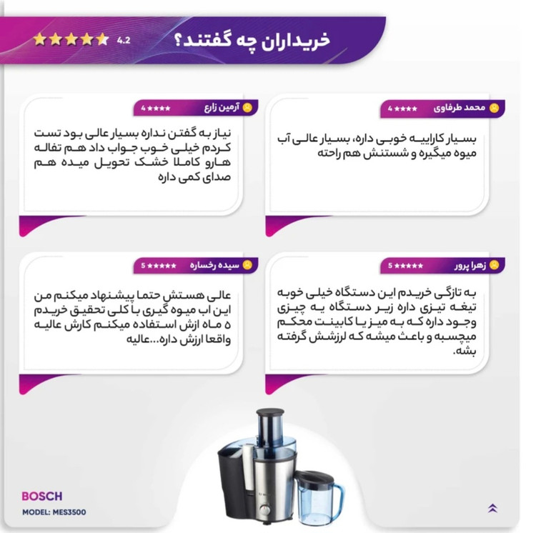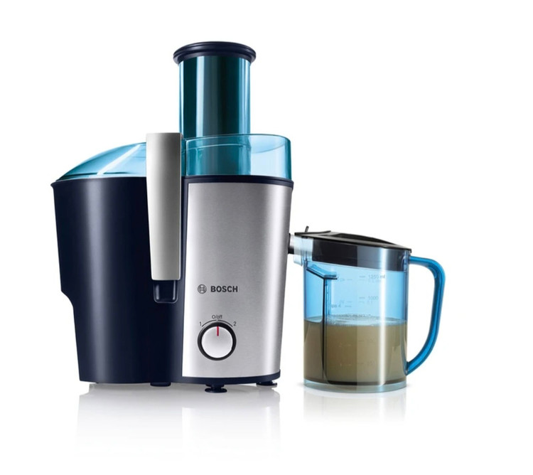 آبمیوه گیری بوش مدل «MES3500» از محصولات پرفروش و پرطرفدار این شرکت است که در کنار طراحی زیبا، کیفیت ساخت بالایی هم دارد. این آبمیوه گیری دارای دو مخزن آبمیوه و تفاله است که هر کدام به گونهای مجزا از دستگاه در کنار آن قرار گرفتهاند. قابلیت جدا شدن مخزنها علاوهبر نظافت آسانتر، ظرفیت بیشتری را هم در اختیار دارندگان آن قرار میدهد. لازم به ذکر است که تیغه اصلی این دستگاه آب میوه گیری از جنس استیل ضد زنگ بوده و دهانه آن هم از قطر مناسب برخوردار است. علاوه بر فیلتر آب میوه گیری که به راحتی قابل شست و شو است، میتوان لوازم جانبی آن را هم در ماشین ظرفشویی قرار داد. برای این دستگاه اقلام همراهی نظیر مخزن پلاستیکی آبمیوه که شفاف و دارای درجه بندی است و همچنین مخزن تفاله آبمیوه گیری در نظر گرفته شده که به راحتی میتوان آنها را پس از پر شدن از دستگاه جدا کرد و پس از وقفهای کوتاه آنها را خالی و برای ادامه فرآیند آبمیوه گیری روی دستگاه قرار داد. آبمیوهگیری بوش مدل «MES3500» دستگاهی تککاره است و میتوان توان آن را در دو سرعت تنظیم کرد. پایههای ضد لغزش زیر این دستگاه مانع از لرزش و جابجایی آن حین کار میشود. لوله خروجی دستگاه و پارچ آبمیوه آن طوری طراحی شدهاند تا آبمیوه مستقیم وارد پارچ شده و چکهای ایجاد نشود. لازم به ذکر است که ظرفیت پارچ این آب میوه گیری بوش حدود 3 تا 4 لیوان کوچک یا متوسط است.